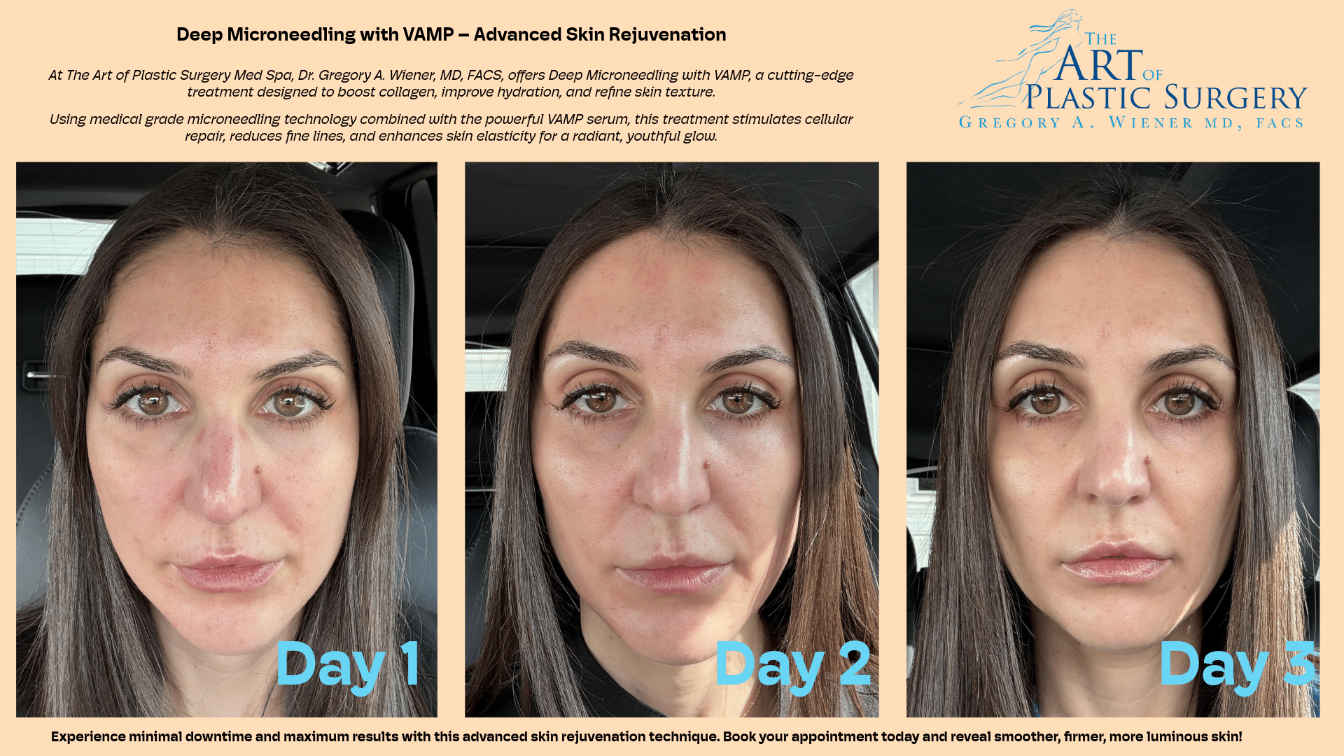 The VAMP treatment speeds up recovery, enhances healing and rejuvenation - that is what the progression is supposed to demonstrate. This combination accelerates skin repair, improves hydration, and enhances elasticity. The treatment is known for reducing wrinkles, acne scars, hyperpigmentation, and overall skin texture.